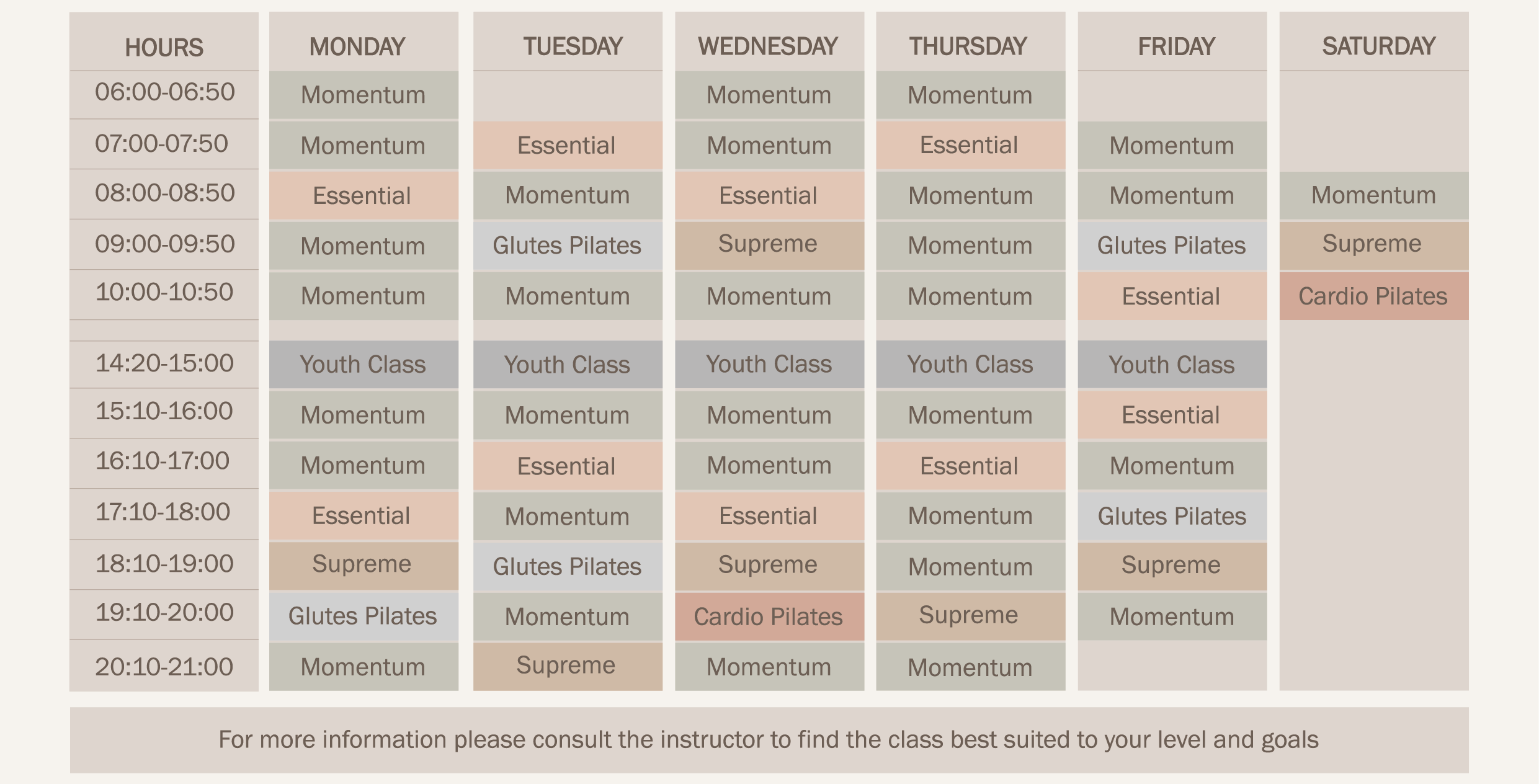 The Essential Group is for beginners and focuses on the basic principles of Pilates, aiming to strengthen the core and develop flexibility.
